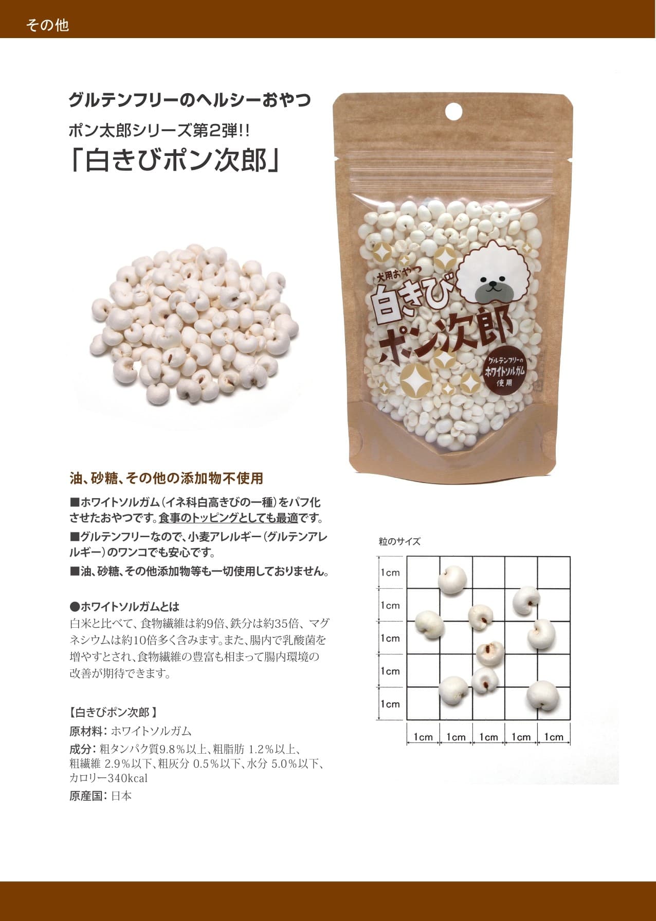 グルテンフリーなので、小麦アレルギー(グルテンアレルギー)のワンコでも安心です。ホワイトソルガム(イネ科白高きびの一種)をパフ化させたおやつです。食事のトッピングとしても最適です。油、砂糖、その他添加物等も一切使用しておりません。ホワイトソルガムとは白米と比べて、食物繊維は約9倍、鉄分は約35倍、マグネシウムは約10倍多く含みます。また、腸内で乳酸菌を増やすとされ、食物繊維の豊富も相まって腸内環境の改善が期待できます。
