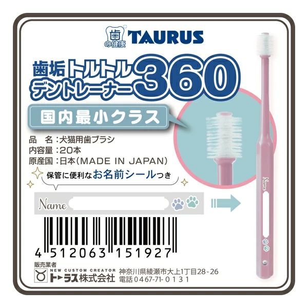 全集360度の歯ブラシだから、歯垢をしっかり除去し口臭を軽減します。手を回さず横磨きで、手の甲で擦って痛くない強さが磨く力の目安です。極小ヘッドと糸径(0.06mm) なので、奥まで磨きやすくなっています。誤ってペットが噛んでも歯ブラシの柄や飼い主様の心も折れにくい設計です。ペットが嫌がりにくい極細毛を全方向に高密度移植(2万本以上)。グリップはどこからでも持ちやすい六角形状になっています。