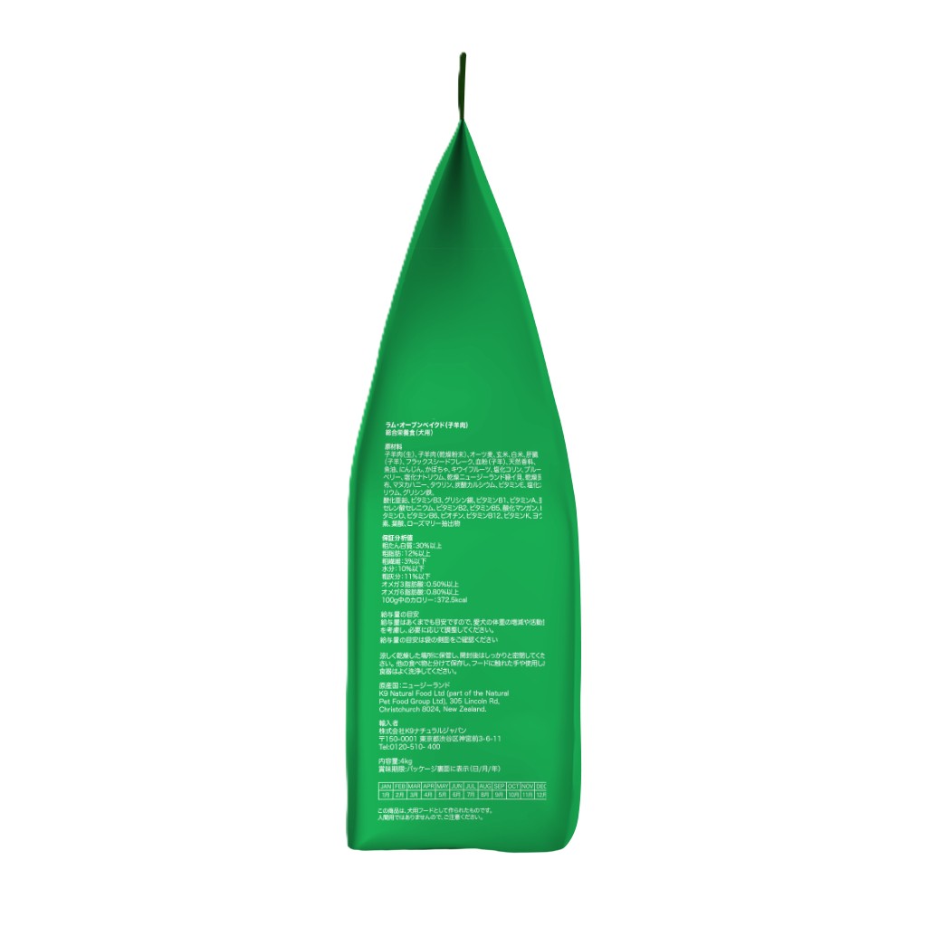 | 原材料 | 子羊肉(生)、子羊肉(乾燥粉末)、オーツ麦、玄米、白米、肝臓(子羊)、フラックスシードフレーク、血粉(子羊)、天然香料、魚油、にんじん、かぼちゃ、キウイフルーツ、塩化コリン、ブルーベリー、塩化ナトリウム、乾燥ニュージーランド緑イ貝、乾燥昆布、マヌカハニー、タウリン、炭酸カルシウム、ビタミンE、塩化カリウム、グリシン鉄、酸化亜鉛、ビタミンB3、グリシン銅、ビタミンB1、ビタミンA、亜セレン酸セレニウム、ビタミンB2、ビタミンB5、酸化マンガン、ビタミンD、ビタミンB6、ビオチン、ビタミンB12、ビタミンK、ヨウ素、葉酸、ローズマリー抽出物 |