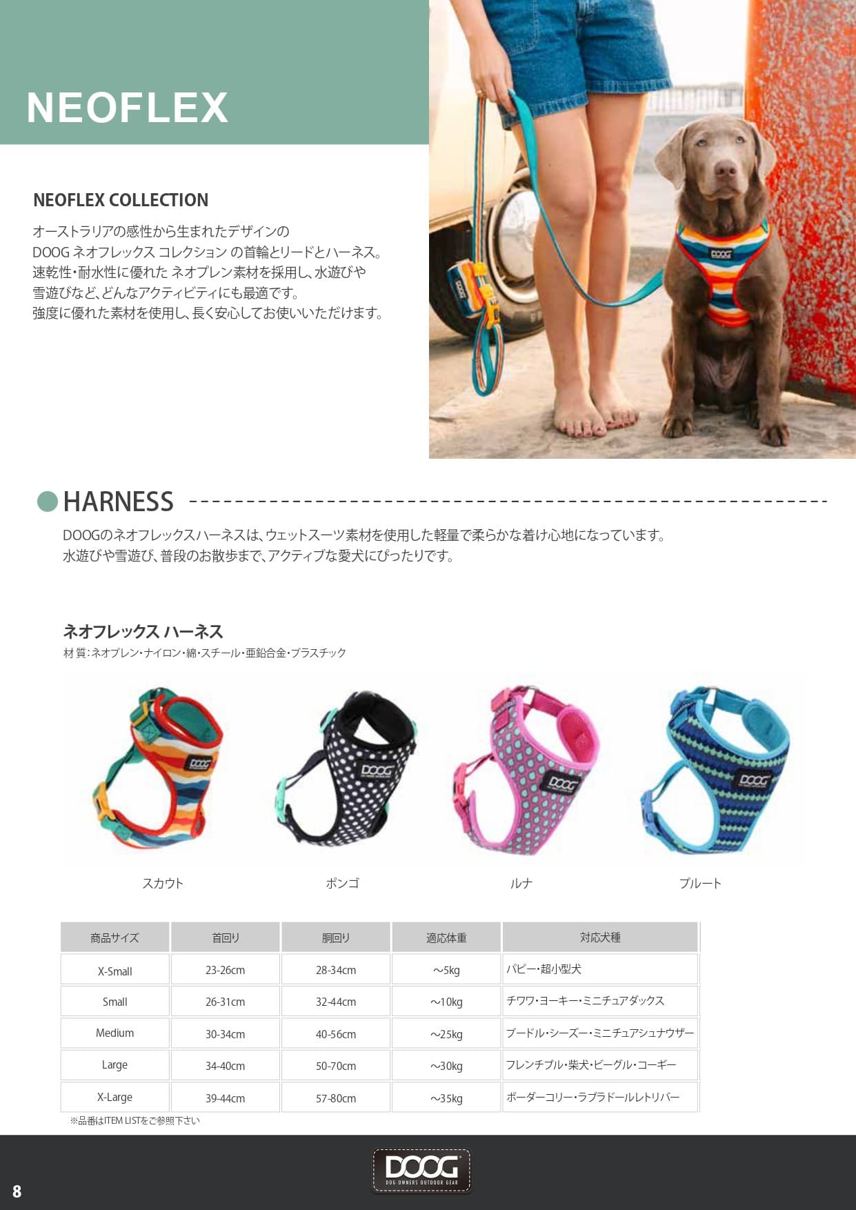 DOOGのネオフレックスハーネスは、ウェットスーツ素材を使用した軽量で柔らかな着け心地になっています。水遊びや雪遊び、普段のお散歩まで、アクティブな愛犬にぴったりです。