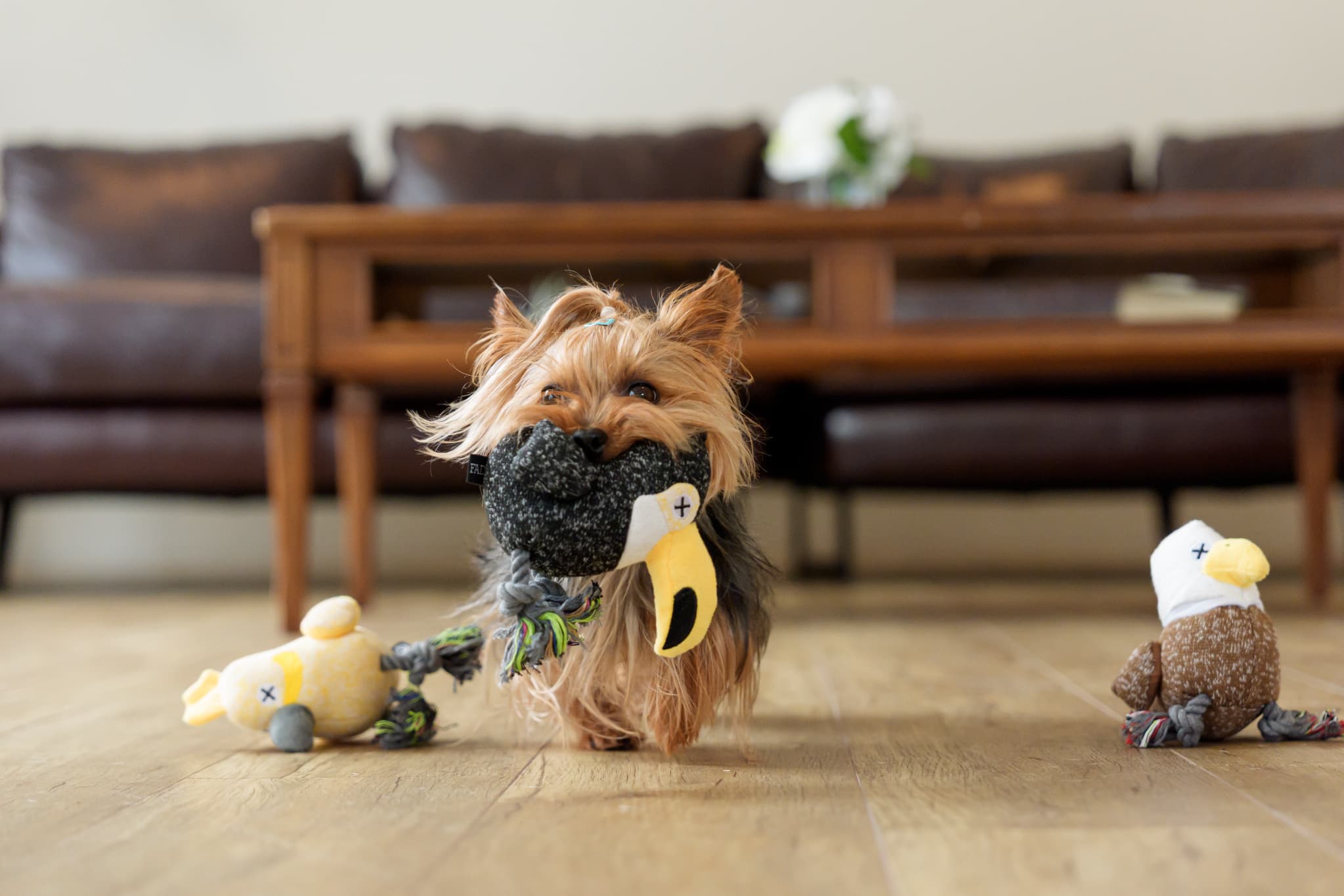 にくめない表情とキューキュー鳴るスクイーカーに、愛犬も夢中!ロープを噛んで遊ぶことでデンタルケアにも。