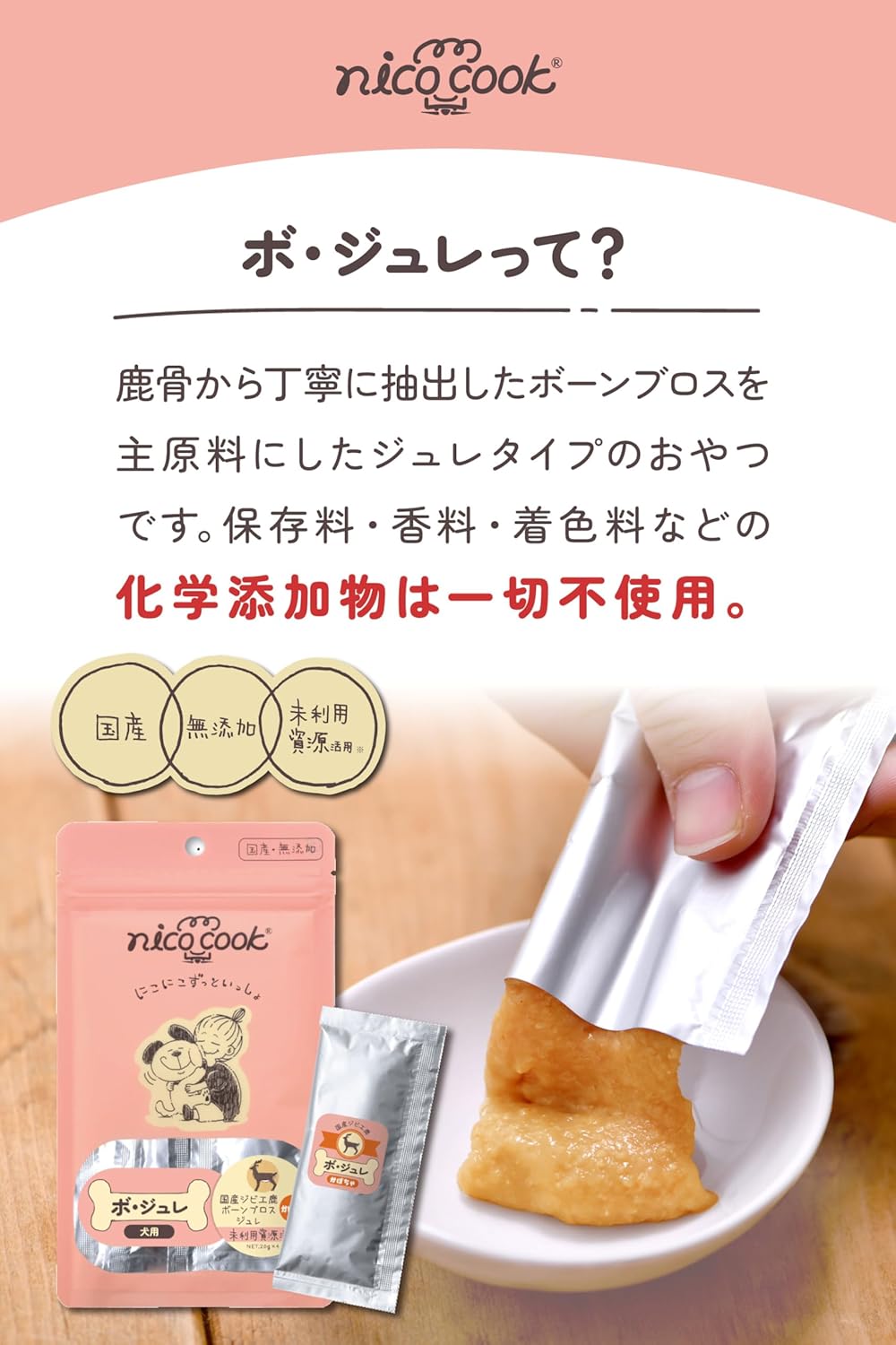 人間の健康食としても注目されている「ボーンブロス」。骨をじっくり煮出すことで、アミノ酸やミネラルなどの栄養素を抽出した伝統的な栄養スープです。「ボ・ジュレ」は、このボーンブロスを愛犬向けに仕上げたジュレタイプのおやつです。原材料は厳選した鹿骨から抽出したエキスととろみづけに玄米を使用し、保存料・香料・着色料などの化学添加物は一切使用していません。嗜好性と食べやすさに配慮し腸内を意識したレシピの水分・栄養成分を含むジュレです。また、かぼちゃでやさしい甘みと彩りをプラスし、より食べやすく仕上げました。そのまま与えるのはもちろん、ドライフードにかけてもお使いいただけます。大切な家族だからこそ、自然の恵みをそのままに。「ボ・ジュレ」は愛犬の毎日を優しく支えます。