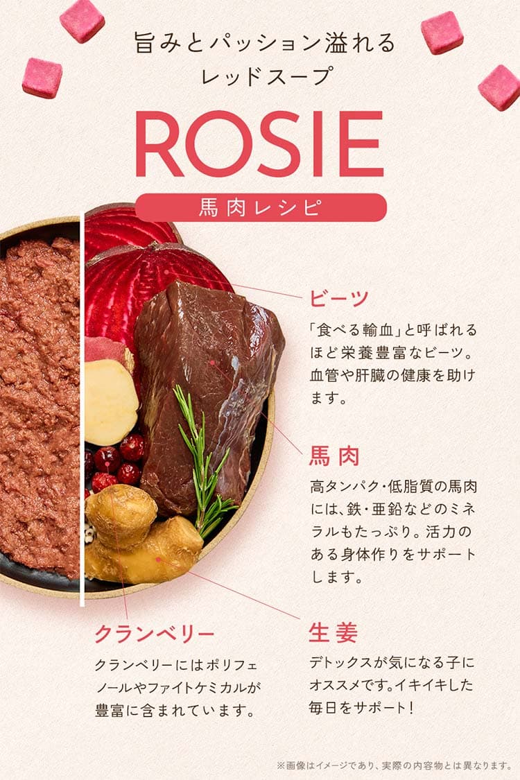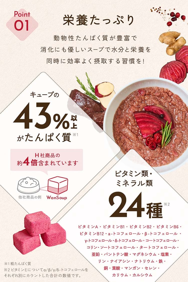 高タンパクな馬肉をメインに、”飲む輸血”ビーツとクランベリーをプラス。抗酸化作用で細胞をダメージから守ります。※身体の健康維持に必要な栄養素を豊富に含んでいることを表しており、WanSoupに輸血と同等の効果があることを表すものではありません。