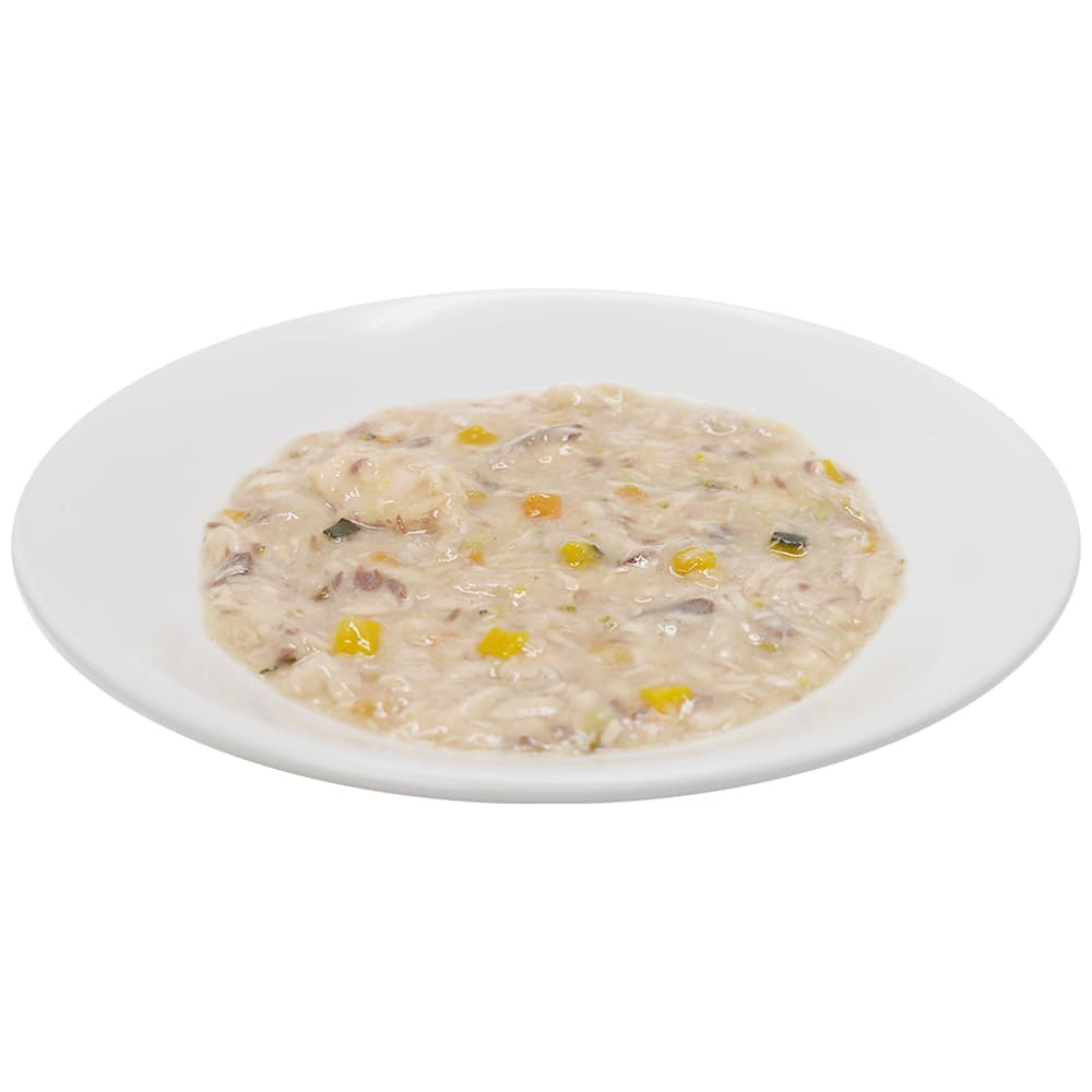 まぐろをフレーク状にほぐし、緑黄色野菜を加え、食べやすいとろみタイプに仕上げました。