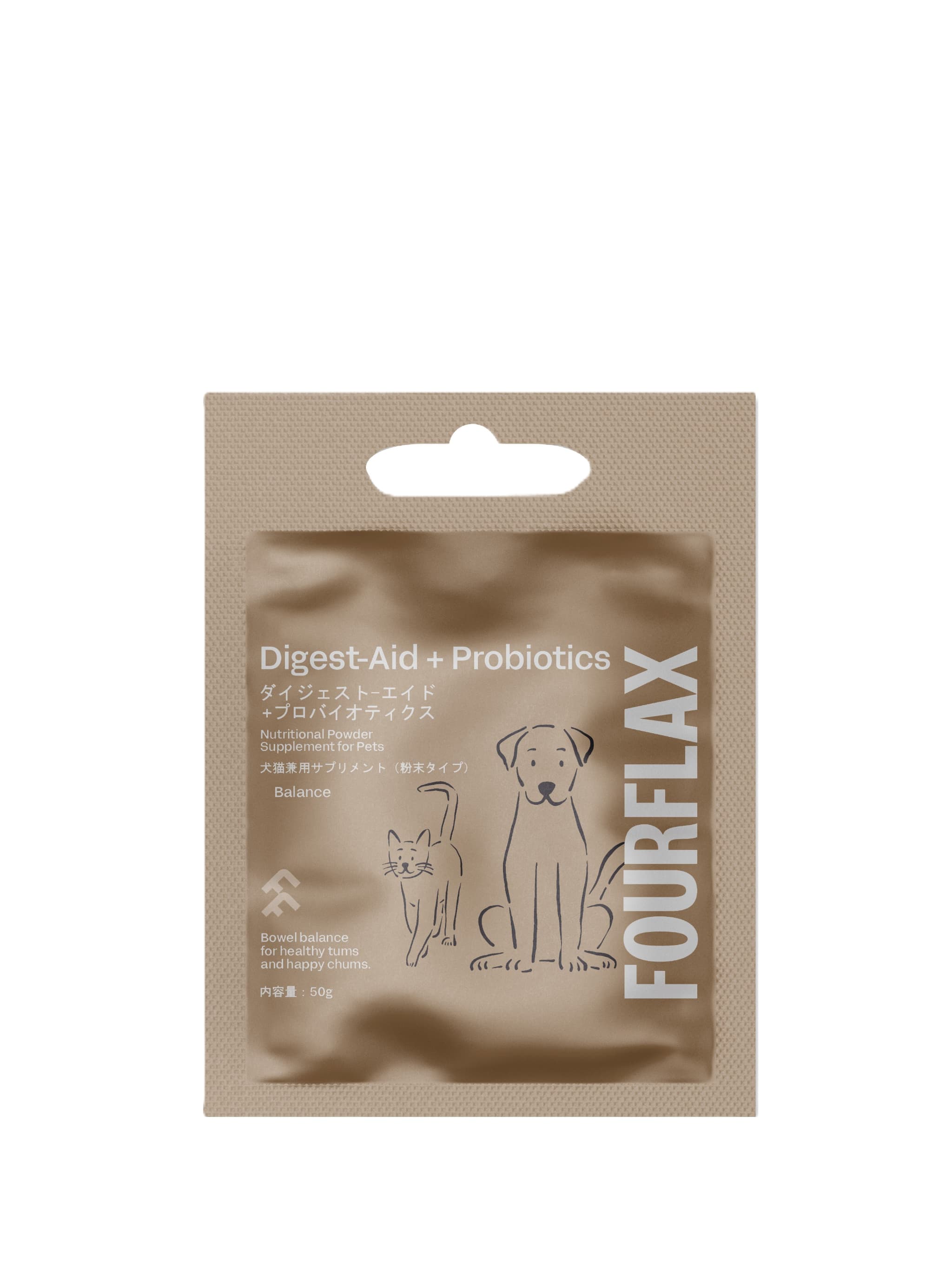 FOURFLAX ニュージーランド グリーン・マッスル パウダーは、「プレバイオティクス」と「プロバイオティクス」により、犬や猫の消化器系の健康をサポートします。腸の機能低下や消化不良、肛門腺に問題がある犬や猫に、特にお勧めです。